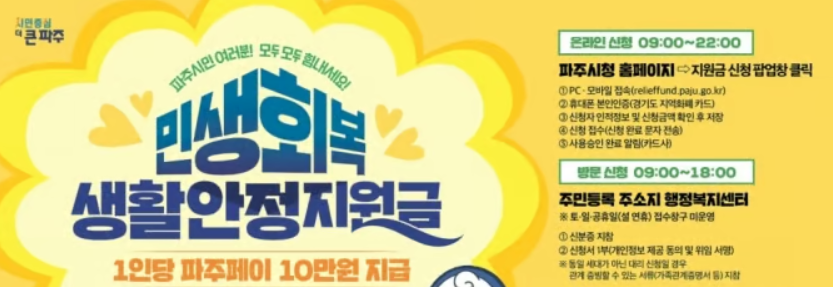 온라인 신청은 파주시 민생회복 생활안정지원금 누리집에서 가능합니다. 운영 시간은 오전 9시 ~ 밤 10시 (주말·공휴일 포함)이니 늦지않게 신청하세요.
