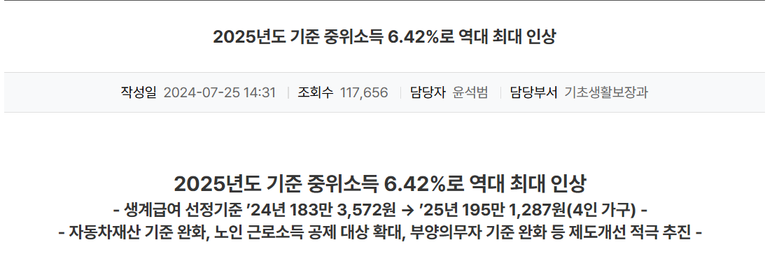 2025년 기준 중위소득은 역대 최고 증가율인 6.42% 인상되었으며, 생계급여 선정기준도 이에 따라 상향되었습니다.