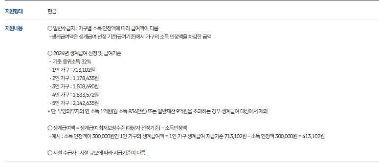 생계급여 외에도 주거급여, 의료급여, 교육급여 등 다양한 복지 혜택을 함께 받을 수 있습니다.