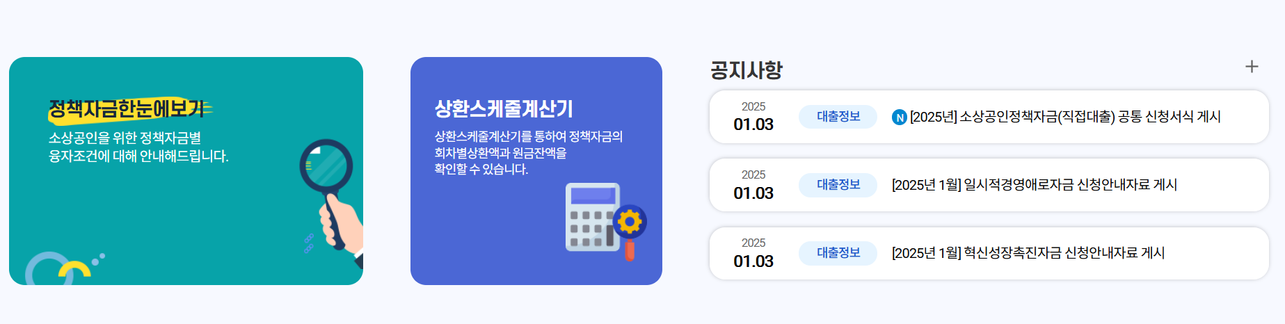 매월 새로운 정책자금 신청 안내와 관련 공지사항이 업데이트됩니다. 2025년 1월에는 몇 가지 공지가 올라왔습니다.