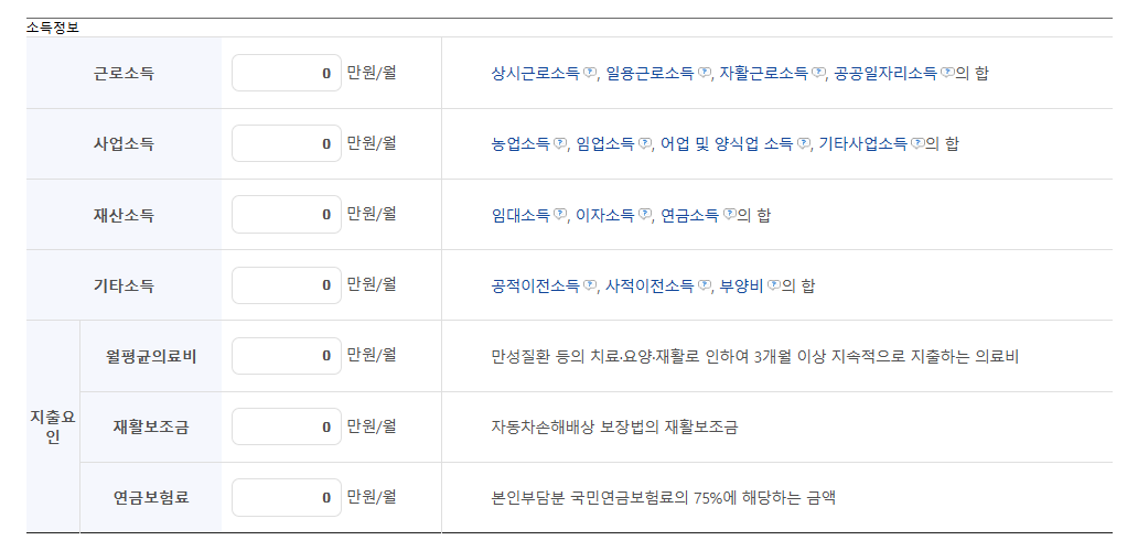 - 가구원 수, 소득, 재산 정보 입력