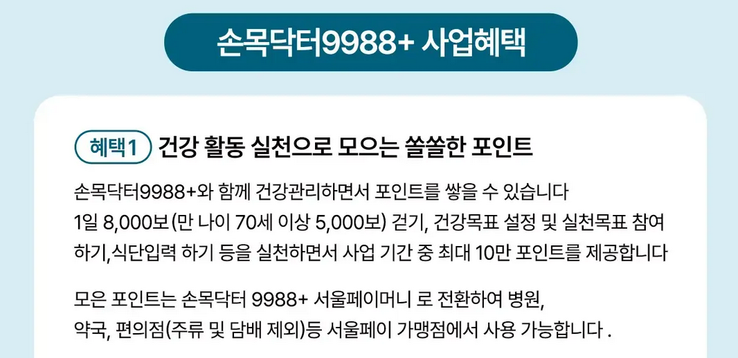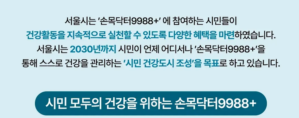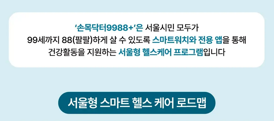 손목닥터 9988은 현재 서울시민 5명 중 1명이 이미 가입했으며 스마트폰만 있으면 누구나 무료로 참여할 수 있고, 걷는 만큼 포인트를 적립해 현금처럼 사용할 수 있는 매우 실용적인 서비스입니다.